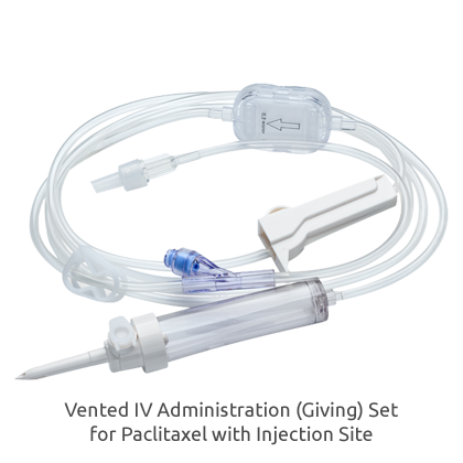 Vented IV Administration (Giving) Set for Paclitaxel with and without Injection SiteThe vented IV administration sets offer customized sets for administration of Paclitaxel or other viscous drugs or drugs that require in-line filtering. The vented IV administration set for Paclitaxel with 0.2 micron filter and vented spike allows comfortable and simple Paclitaxel administration via a luer lock connection. This set replaces the need for an external filter and a separate IV administration set. The Paclitaxel general infusion sets provide luer lock access points to the patient’s IV port. The Paclitaxel sets have an option for an additional needleless injection site.Specifications